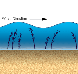 Waves cause an oscillatory motion of the water, but no real forward movement of the water itself until they come close to shore and break. On a calm day with no breeze, a stick thrown in the water will move up and down as the waves pass, but it will stay in the same location. This phenomena of wave motion is best illustrated by swaying seaweed caused by passing waves, which is indicative of the circular movement of the water particles.